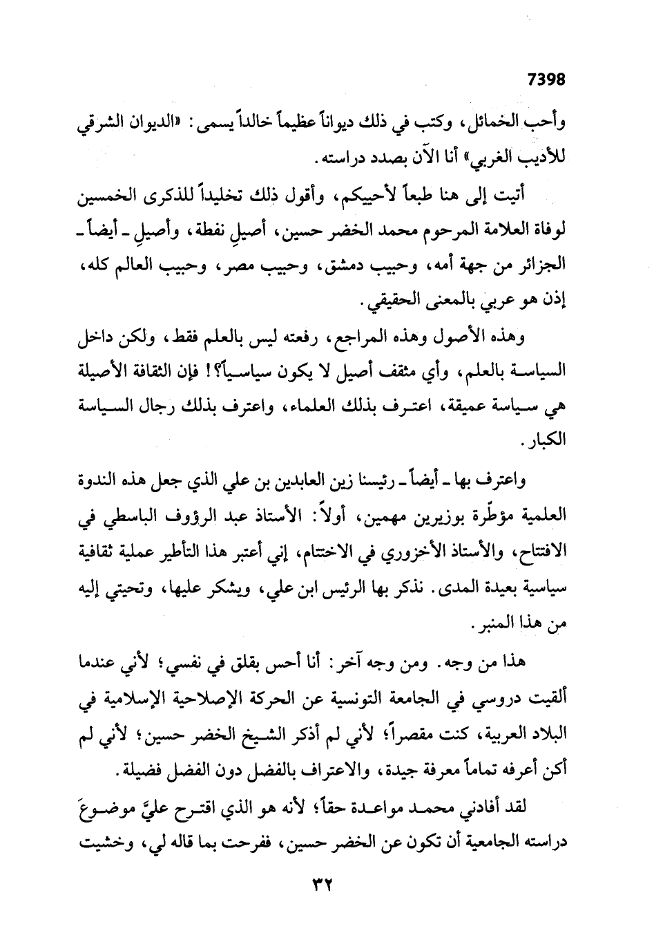أتيت إلى هنا طبعاً لأحييكم، وأقول ذلك تخليداً للذكرى الخمسين لوفاة العلامة المرحوم محمد الخضر حسين، أصيلِ نفطة، وأصيلِ -أيضاً- الجزائر من جهة أمه، وحبيب دمشق، وحبيب مصر، وحبيب العالم كله، إذن هو عربي بالمعنى الحقيقي.