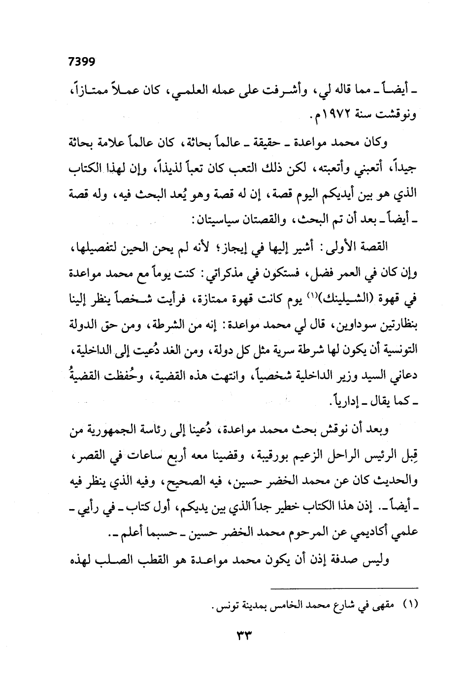 وبعد أن نوقش بحث محمد مواعدة، دُعينا إلى رئاسة الجمهورية من قِبل الرئيس الراحل الزعيم بورقيبة، وقضينا معه أربع ساعات في القصر، والحديث كان عن محمد الخضر حسين، فيه الصحيح، وفيه الذي ينظر فيه -أيضاً-. إذن هذا الكتاب خطير جداً الذي بين يديكم، أول كتاب -في رأيي- علمي أكاديمي عن المرحوم محمد الخضر حسين -حسبما أعلم -.