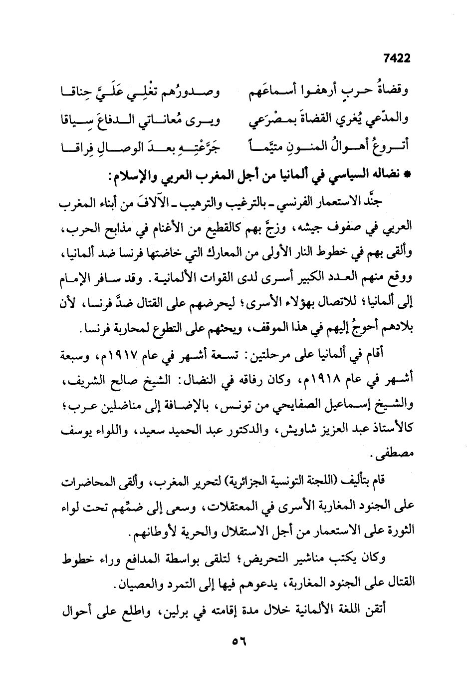 قام بتأليف (اللجنة التونسية الجزائرية) لتحرير المغرب، وألقى المحاضرات على الجنود المغاربة الأسرى في المعتقلات، وسعى إلى ضمِّهم تحت لواء الثورة على الاستعمار من أجل الاستقلال والحرية لأوطانهم.