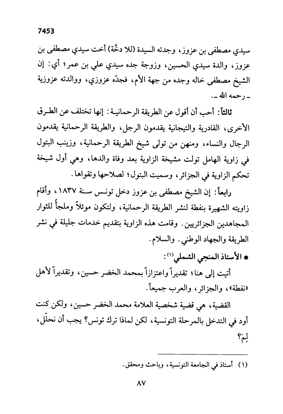 رابعاً: إن الشيخ مصطفى بن عزوز دخل تونس سنة 1837، وأقام زاويته الشهيرة بنفطة لنشر الطريقة الرحمانية، ولتكون موئلاً وملجأً للثوار المجاهدين الجزائريين. وقامت هذه الزاوية بتقديم خدمات جليلة في نشر الطريقة والجهاد الوطني. والسلام.