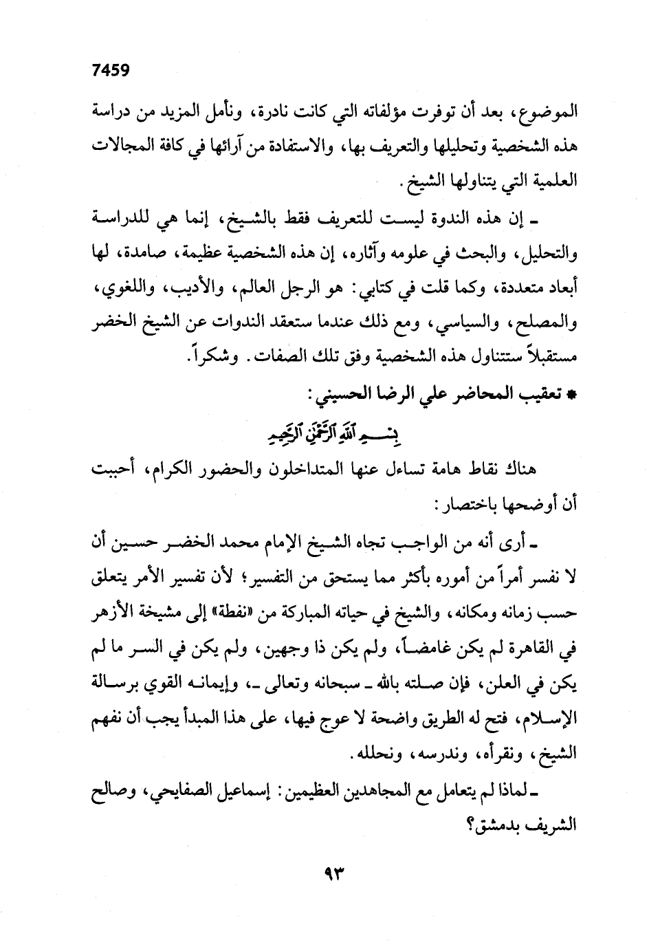 - إن هذه الندوة ليست للتعريف فقط بالشيخ، إنما هي للدراسة والتحليل، والبحث في علومه وآثاره، إن هذه الشخصية عظيمة، صامدة، لها أبعاد متعددة، وكما قلت في كتابي: هو الرجل العالم، والأديب، واللغوي، والمصلح، والسياسي، ومع ذلك عندما ستعقد الندوات عن الشيخ الخضر مستقبلاً ستتناول هذه الشخصية وفق تلك الصفات. وشكراً.