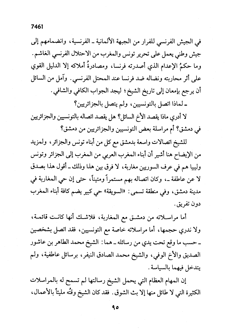 في الجيش الفرنسي للفرار من الجبهة الألمانية - الفرنسية، وانضمامهم إلى جيش وطني يعمل على تحرير تونس والمغرب من الاحتلال الفرنسي الغاشم. وما حكمُ الإعدام الذي أصدرته فرنسا، ومصادرةُ أملاكه إلا الدليل القوي على أثر محاربته ونضاله ضد فرنسا عند المحتل الفرنسي. وآمل من السائل أن يرجع بإمعان إلى تاريخ الشيخ؛ ليجد الجواب الكافي والشافي.