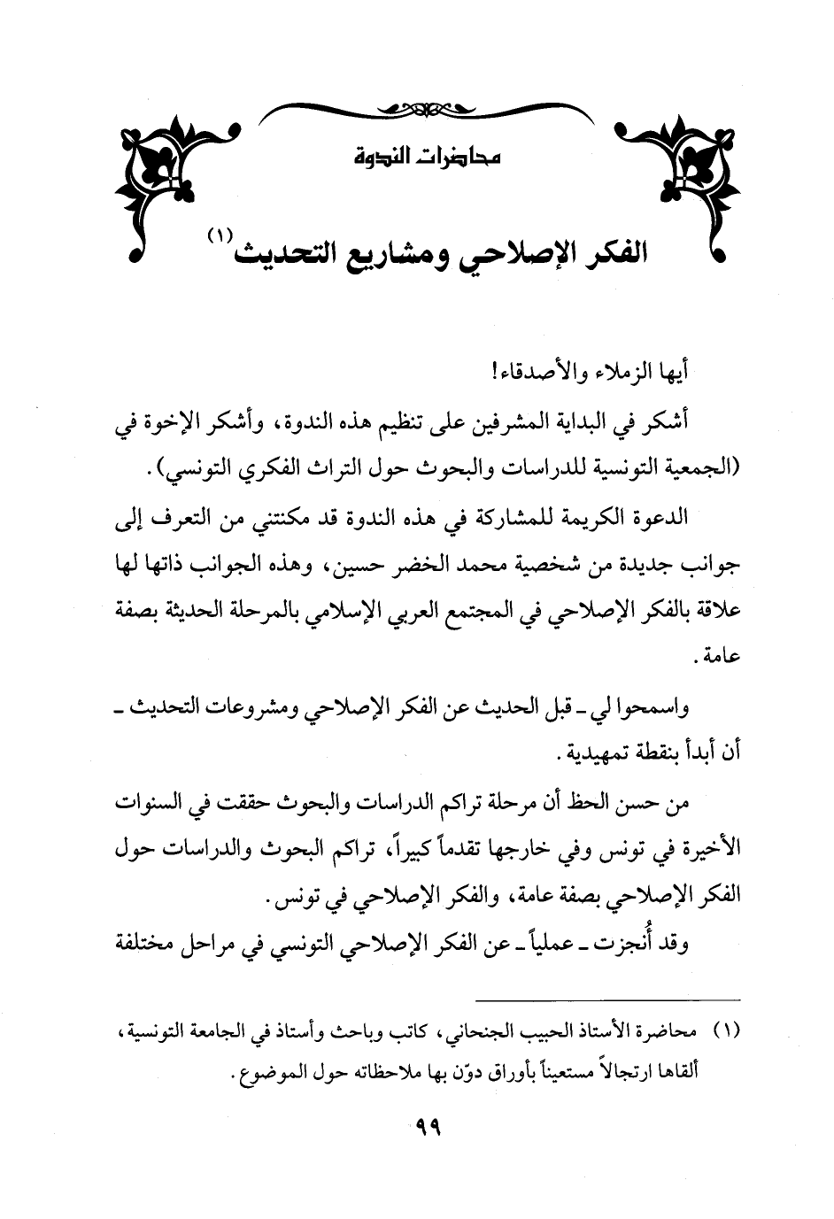 الدعوة الكريمة للمشاركة في هذه الندوة قد مكنتني من التعرف إلى جوانب جديدة من شخصية محمد الخضر حسين، وهذه الجوانب ذاتها لها علاقة بالفكر الإصلاحي في المجتمع العربي الإسلامي بالمرحلة الحديثة بصفة عامة.