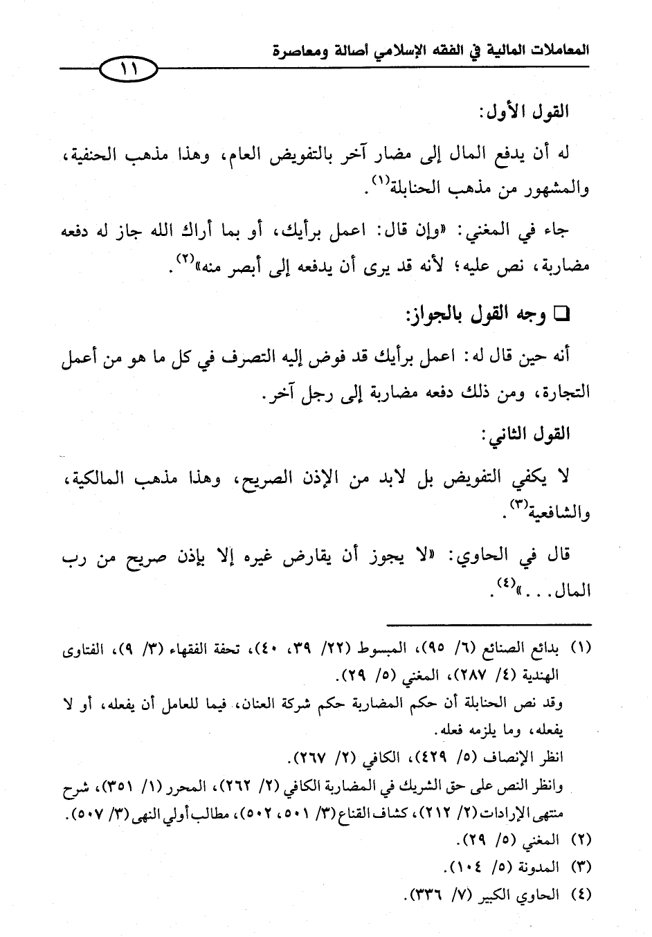 له أن يدفع المال إلى مضار آخر بالتفويض العام، وهذا مذهب الحنفية، والمشهور من مذهب الحنابلة (¬١).