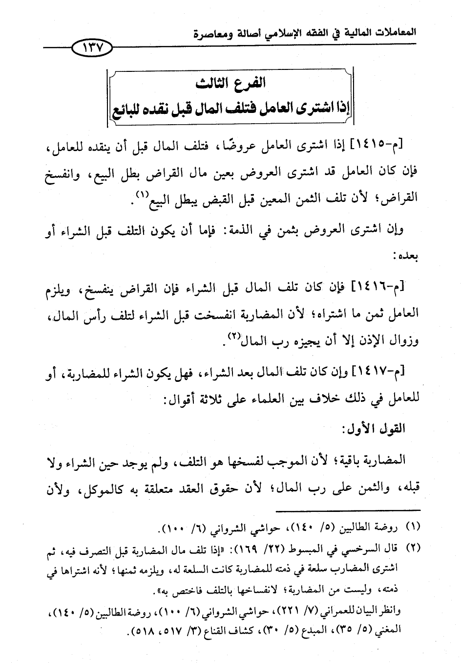 [م - ١٤١٧] وإن كان تلف المال بعد الشراء، فهل يكون الشراء للمضاربة، أو للعامل في ذلك خلاف بين العلماء على ثلاثة أقوال: