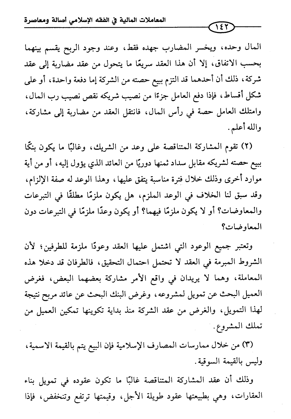 المال وحده، ويخسر المضارب جهده فقط، وعند وجود الربح يقسم بينهما بحسب الاتفاق، إلا أن هذا العقد سريعًا ما يتحول من عقد مضاربة إلى عقد شركة، ذلك أن أحدهما قد التزم ببيع حصته من الشركة إما دفعة واحدة، أو على شكل أقساط، فإذا دفع العامل جزءًا من نصيب شريكه نقص نصيب رب المال، وامتلك العامل حصة في رأس المال، فانتقل العقد من مضاربة إلى مشاركة، والله أعلم.