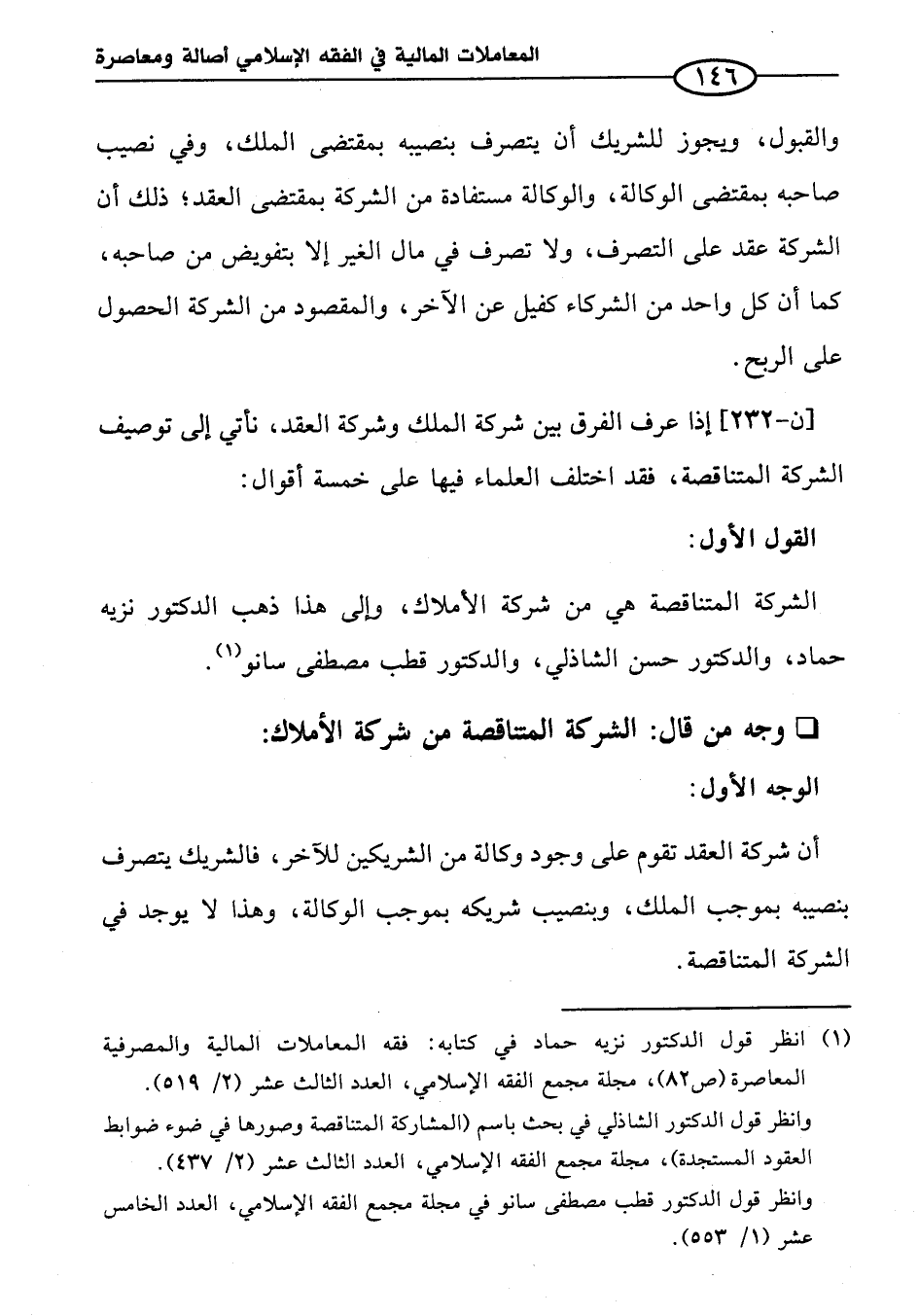 [ن -٢٣٢] إذا عرف الفرق بين شركة الملك وشركة العقد، نأتي إلى توصيف الشركة المتناقصة، فقد اختلف العلماء فيها على خمسة أقوال: