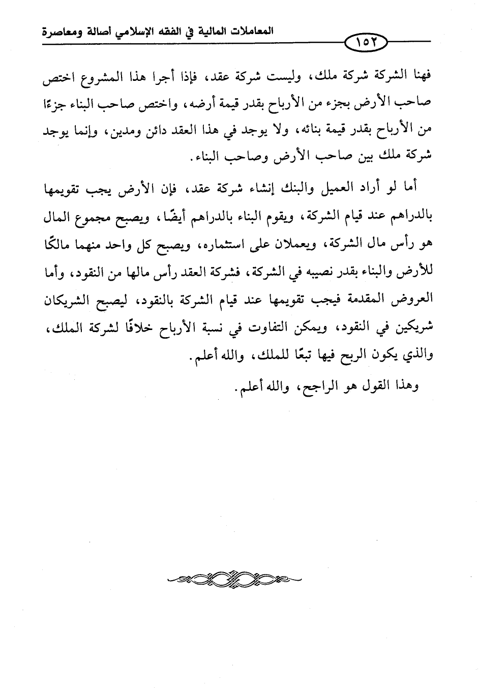 أما لو أراد العميل والبنك إنشاء شركة عقد، فإن الأرض يجب تقويمها بالدراهم عند قيام الشركة، ويقوم البناء بالدراهم أيضًا، ويصبح مجموع المال هو رأس مال الشركة، ويعملان على استثماره، ويصبح كل واحد منهما مالكًا للأرض والبناء بقدر نصيبه في الشركة، فشركة العقد رأس مالها من النقود، وأما العروض المقدمة فيجب تقويمها عند قيام الشركة بالنقود، ليصبح الشريكان شريكين في النقود، ويمكن التفاوت في نسبة الأرباح خلافًا لشركة الملك، والذي يكون الربح فيها تبعًا للملك، والله أعلم.