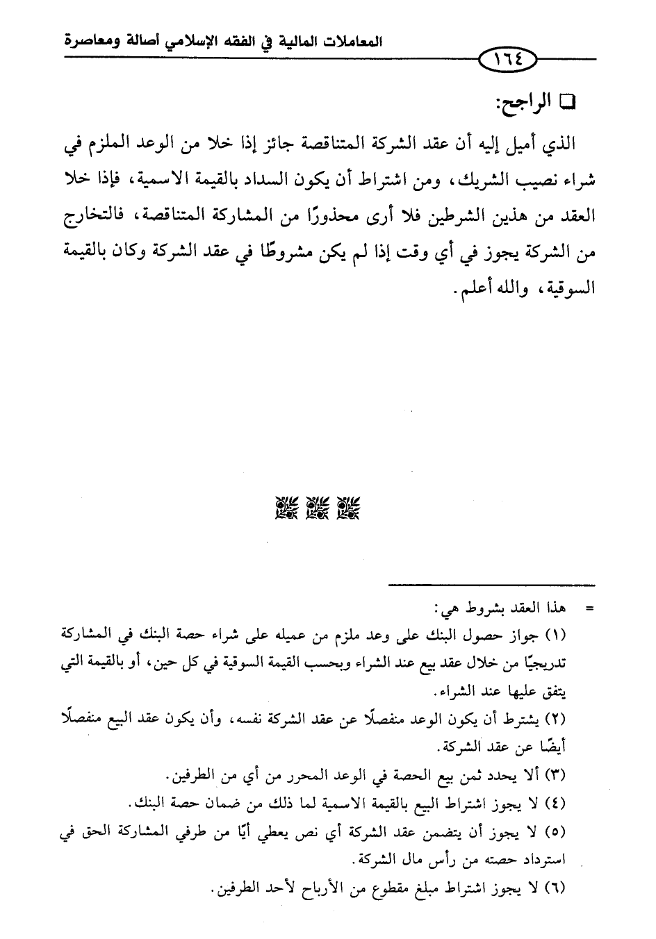 (١) جواز حصول البنك على وعد ملزم من عميله على شراء حصة البنك في المشاركة تدريجيًا من خلال عقد بيع عند الشراء وبحسب القيمة السوقية في كل حين، أو بالقيمة التي يتفق عليها عند الشراء.