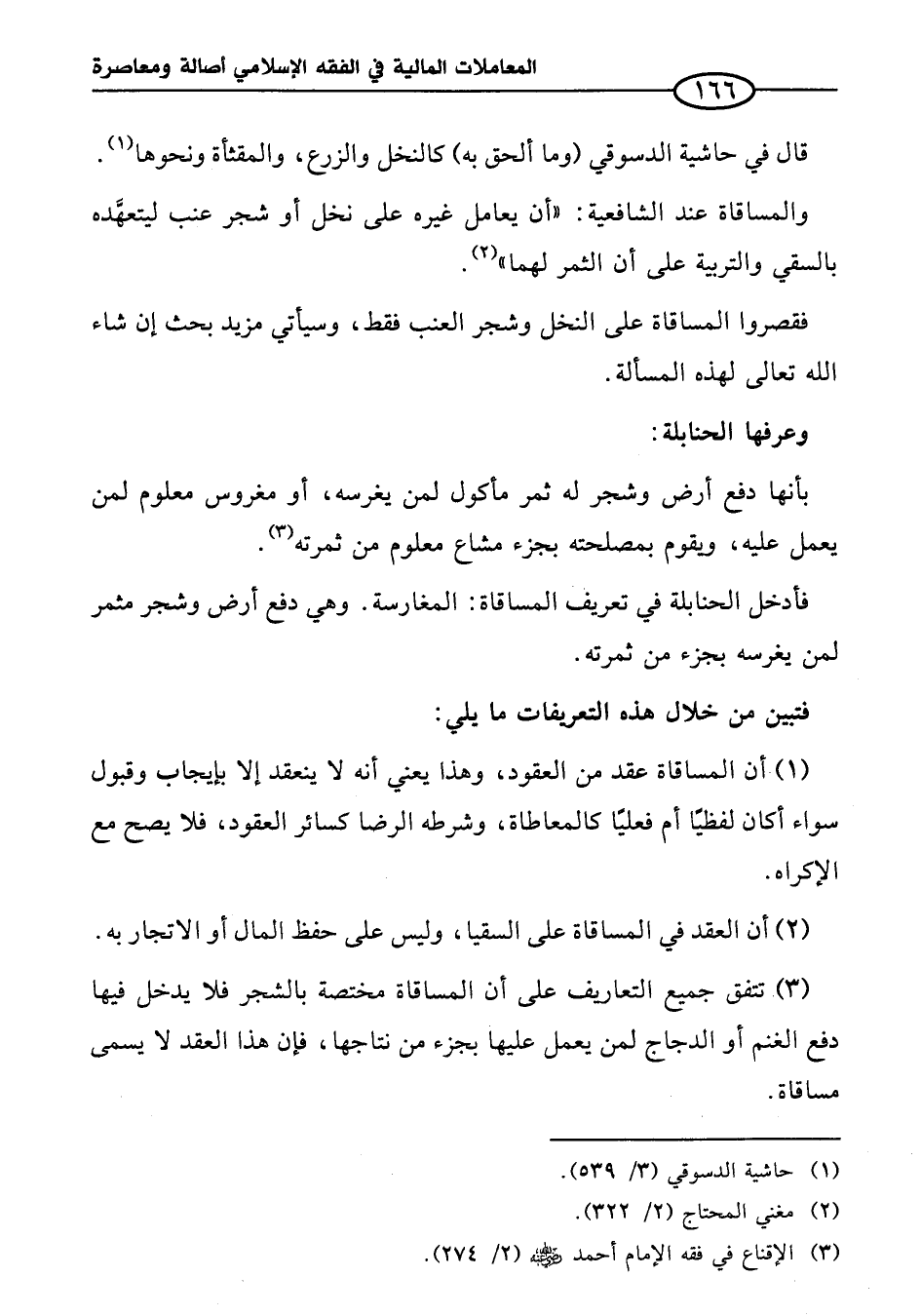 (٣) تتفق جميع التعاريف على أن المساقاة مختصة بالشجر فلا يدخل فيها دفع الغنم أو الدجاج لمن يعمل عليها بجزء من نتاجها، فإن هذا العقد لا يسمى مساقاة.