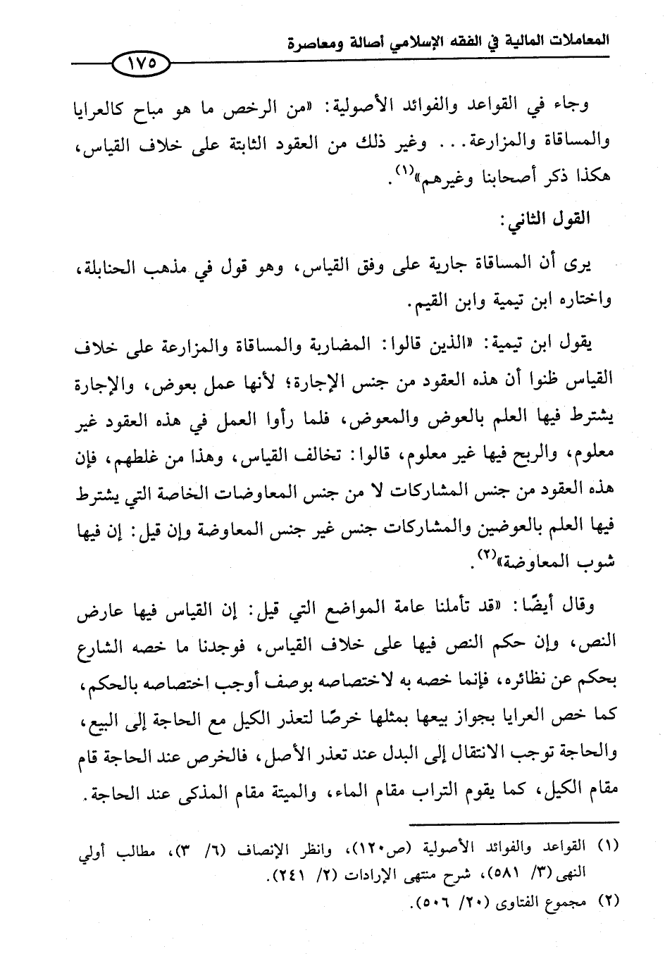 يقول ابن تيمية: "الذين قالوا: المضاربة والمساقاة والمزارعة على خلاف القياس ظنوا أن هذه العقود من جنس الإجارة؛ لأنها عمل بعوض، والإجارة يشترط فيها العلم بالعوض والمعوض، فلما رأوا العمل في هذه العقود غير معلوم، والربح فيها غير معلوم، قالوا: تخالف القياس، وهذا من غلطهم، فإن هذه العقود من جنس المشاركات لا من جنس المعاوضات الخاصة التي يشترط فيها العلم بالعوضين والمشاركات جنس غير جنس المعاوضة وإن قيل: إن فيها شوب المعاوضة" (¬٢).
