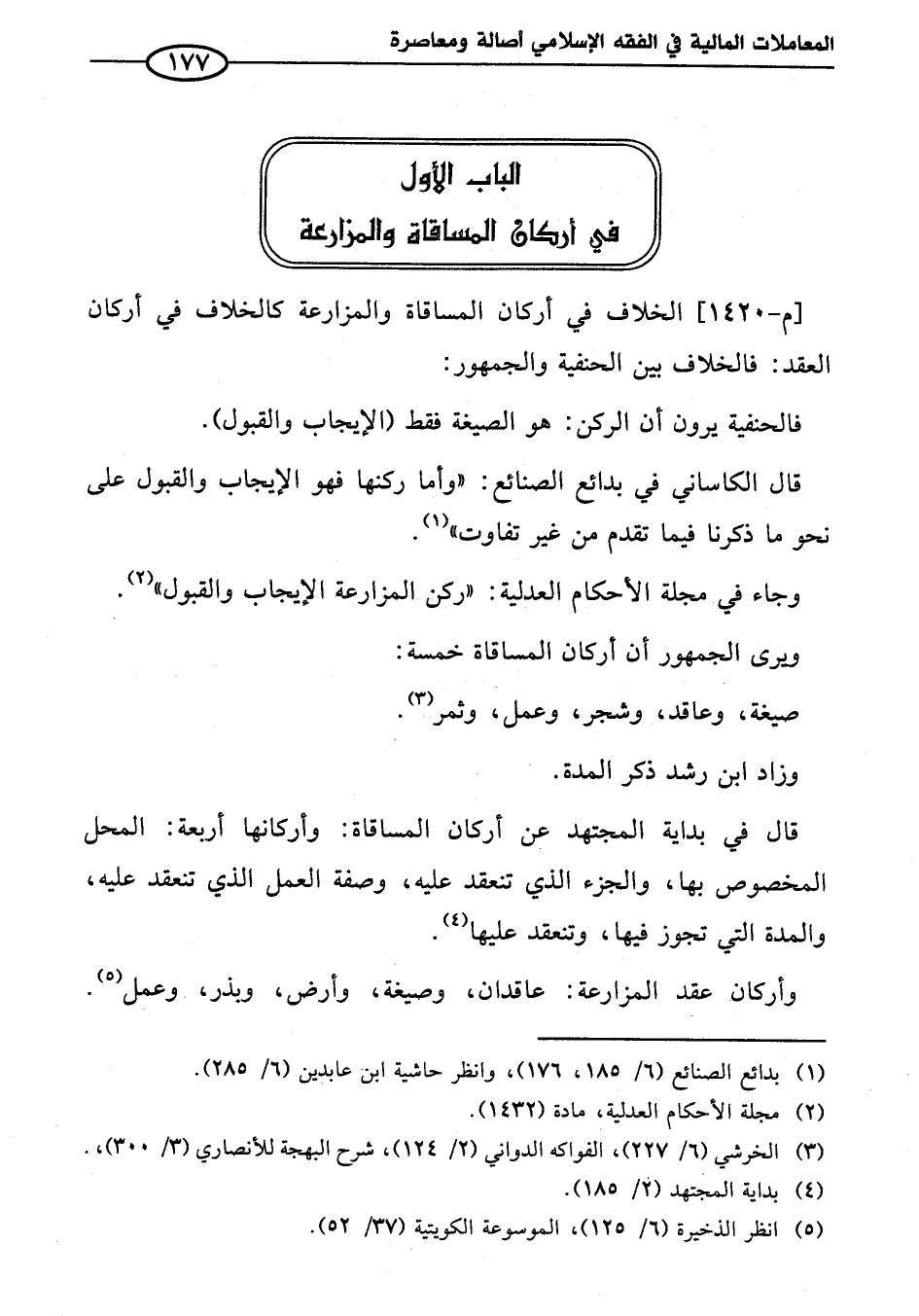 قال في بداية المجتهد عن أركان المساقاة: وأركانها أربعة: المحل المخصوص بها، والجزء الذي تنعقد عليه، وصفة العمل الذي تنعقد عليه، والمدة التي تجوز فيها، وتنعقد عليها (¬٤).