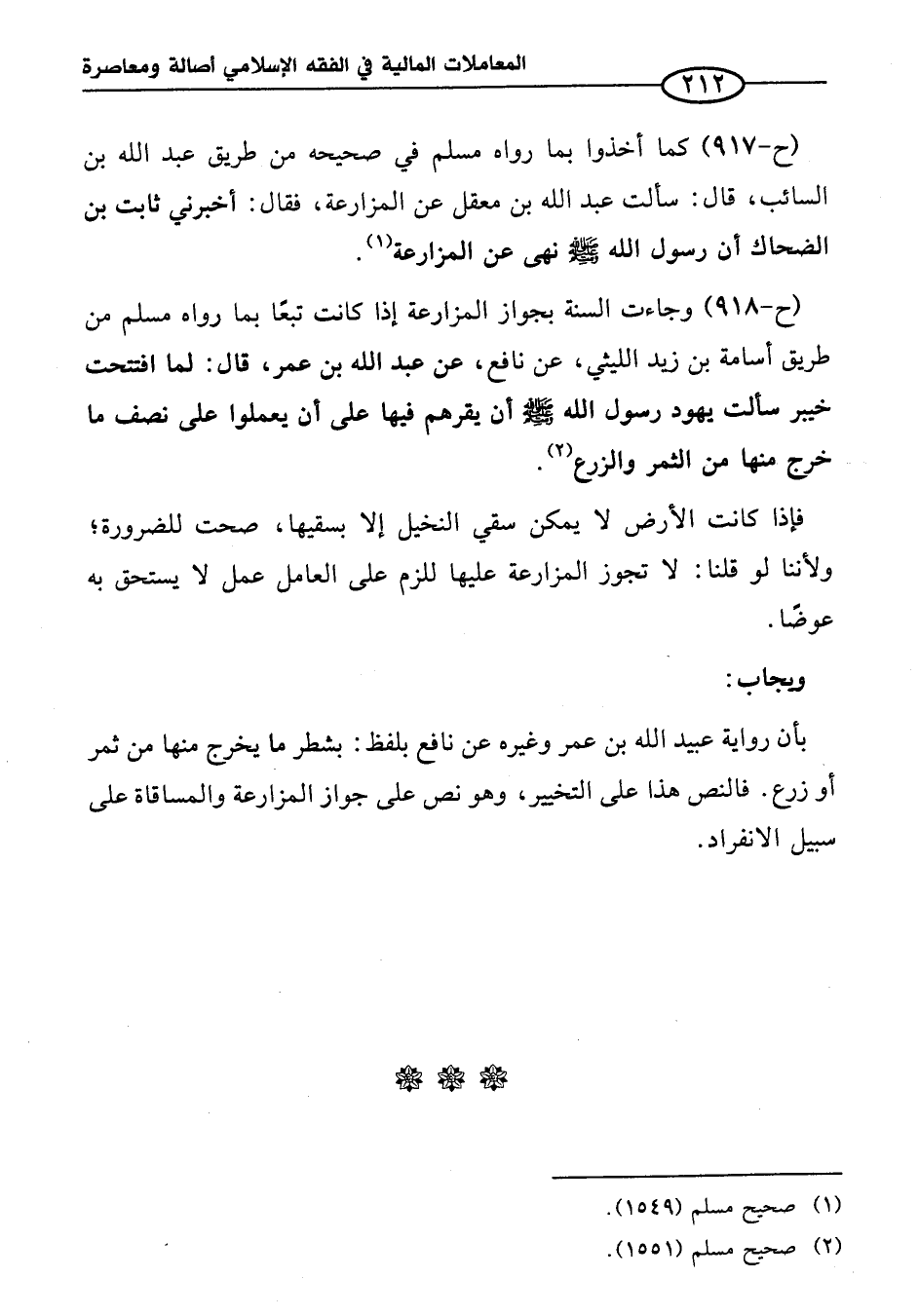 (ح -٩١٧) كما أخذوا بما رواه مسلم في صحيحه من طريق عبد الله بن السائب، قال: سألت عبد الله بن معقل عن المزارعة، فقال: أخبرني ثابت بن الضحاك أن رسول الله - صلى الله عليه وسلم - نهى عن المزارعة (¬١).