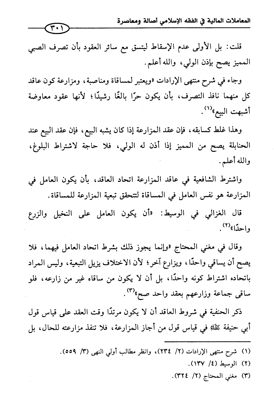وجاء في شرح منتهى الإرادات "ويعتبر لمساقاة ومناصبة، ومزارعة كون عاقد كل منهما نافذ التصرف، بأن يكون حرًا بالغًا رشيدًا؛ لأنها عقود معاوضة أشبهت البيع" (¬١).