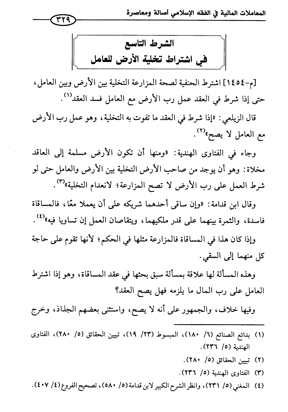 [م - ١٤٥٤] اشترط الحنفية لصحة المزارعة التخلية بين الأرض وبين العامل، حتى إذا شرط في العقد عمل رب الأرض مع العامل فسد العقد (¬١).