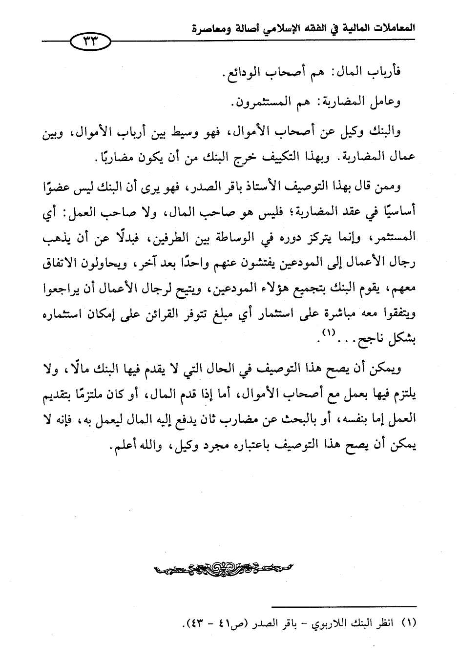 وممن قال بهذا التوصيف الأستاذ باقر الصدر، فهو يرى أن البنك ليس عضوًا أساسيًا في عقد المضاربة؛ فليس هو صاحب المال، ولا صاحب العمل: أي المستثمر، وإنما يتركز دوره في الوساطة بين الطرفين، فبدلًا عن أن يذهب رجال الأعمال إلى المودعين يفتشون عنهم واحداً بعد آخر، ويحاولون الاتفاق معهم، يقوم البنك بتجميع هؤلاء المودعين، ويتيح لرجال الأعمال أن يراجعوا ويتفقوا معه مباشرة على استثمار أي مبلغ تتوفر القرائن على إمكان استثماره بشكل ناجح ... (¬١).