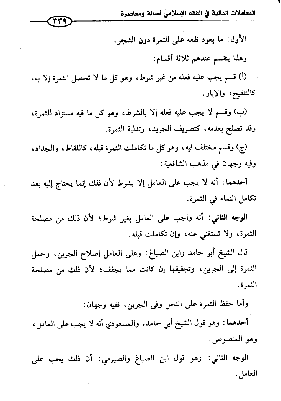 أحدهما: أنه لا يجب على العامل إلا بشرط لأن ذلك إنما يحتاج إليه بعد تكامل النماء في الثمرة.
