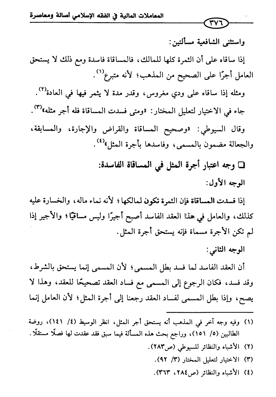 وقال السيوطي: "وصحيح المساقاة والقراض والإجارة، والمسابقة، والجعالة مضمون بالمسمى، وفاسدها بأجرة المثل" (¬٤).