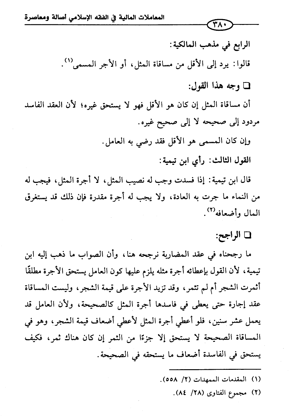 ما رجحناه في عقد المضاربة نرجحه هنا، وأن الصواب ما ذهب إليه ابن تيمية؛ لأن القول بإعطائه أجرة مثله يلزم عليها كون العامل يستحق الأجرة مطلقاً أثمرت الشجر أم لم تثمر، وقد تزيد الأجرة على قيمة الشجر، وليست المساقاة عقد إجارة حتى يعطى في فاسدها أجرة المثل كالصحيحة، ولأن العامل قد يعمل عشر سنين، فلو أعطي أجرة المثل لأعطي أضعاف قيمة الشجر، وهو في المساقاة الصحيحة لا يستحق إلا جزءًا من الثمر إن كان هناك ثمر، فكيف يستحق في الفاسدة أضعاف ما يستحقه في الصحيحة.