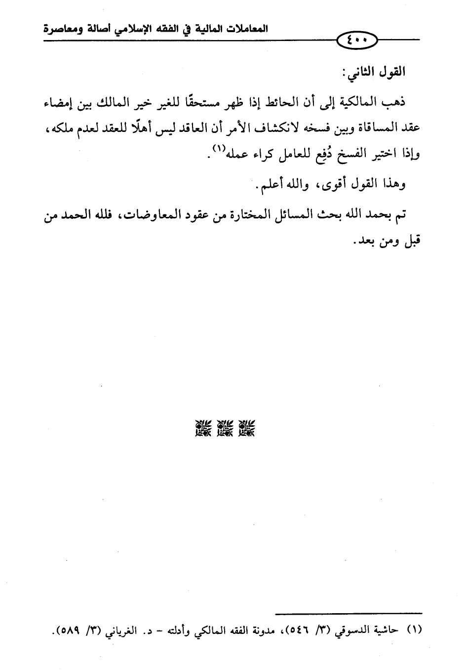 (¬١) حاشية الدسوقي (٣/ ٥٤٦)، مدونة الفقه المالكي وأدلته - د. الغرياني (٣/ ٥٨٩).