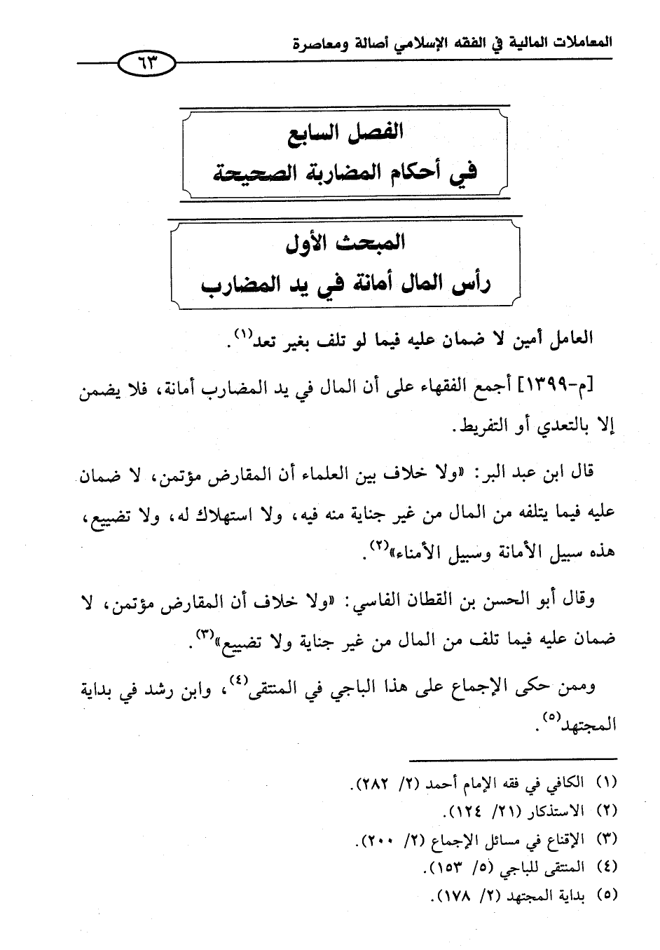 وقال أبو الحسن بن القطان الفاسي: "ولا خلاف أن المقارض مؤتمن، لا ضمان عليه فيما تلف من المال من غير جناية ولا تضييع" (¬٣).