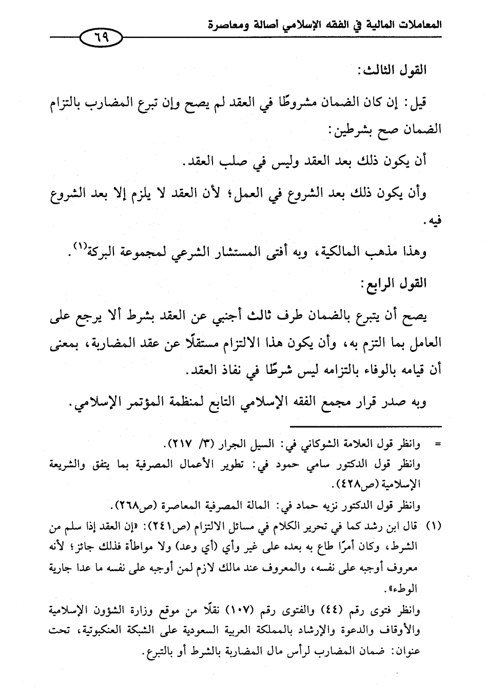 وانظر فتوى رقم (٤٤) والفتوى رقم (١٠٧) نقلًا من موقع وزارة الشؤون الإِسلامية والأوقاف والدعوة والإرشاد بالمملكة العربية السعودية على الشبكة العنكبوتية، تحت عنوان: ضمان المضارب لرأس مال المضاربة بالشرط أو بالتبرع.