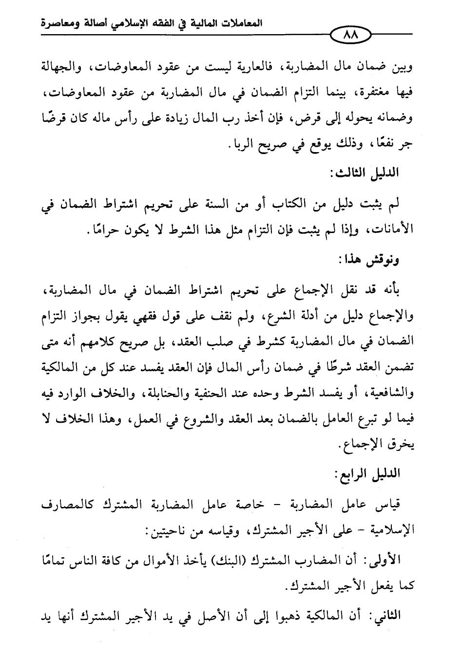 بأنه قد نقل الإجماع على تحريم اشتراط الضمان في مال المضاربة، والإجماع دليل من أدلة الشرع، ولم نقف على قول فقهي يقول بجواز التزام الضمان في مال المضاربة كشرط في صلب العقد، بل صريح كلامهم أنه متى تضمن العقد شرطًا في ضمان رأس المال فإن العقد يفسد عند كل من المالكية والشافعية، أو يفسد الشرط وحده عند الحنفية والحنابلة، والخلاف الوارد فيه فيما لو تبرع العامل بالضمان بعد العقد والشروع في العمل، وهذا الخلاف لا يخرق الإجماع.