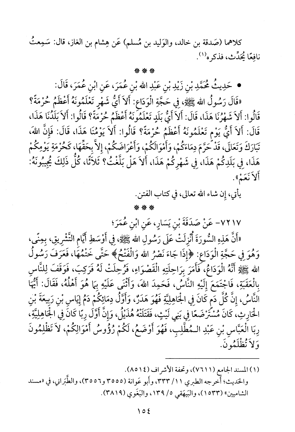 «قال رسول الله صَلى الله عَليه وسَلم في حجة الوداع: ألا أي شهر تعلمونه أعظم حرمة؟ قالوا: ألا شهرنا هذا، قال: ألا أي بلد تعلمونه أعظم حرمة؟ قالوا: ألا بلدنا هذا، قال: ألا أي يوم تعلمونه أعظم حرمة؟ قالوا: ألا يومنا هذا، قال: فإن الله، تبارك وتعالى، قد حرم دماءكم، وأموالكم، وأعراضكم، إلا بحقها، كحرمة يومكم هذا، في بلدكم هذا، في شهركم هذا، ألا هل بلغت؟ ثلاثا، كل ذلك يجيبونه: ألا نعم».
