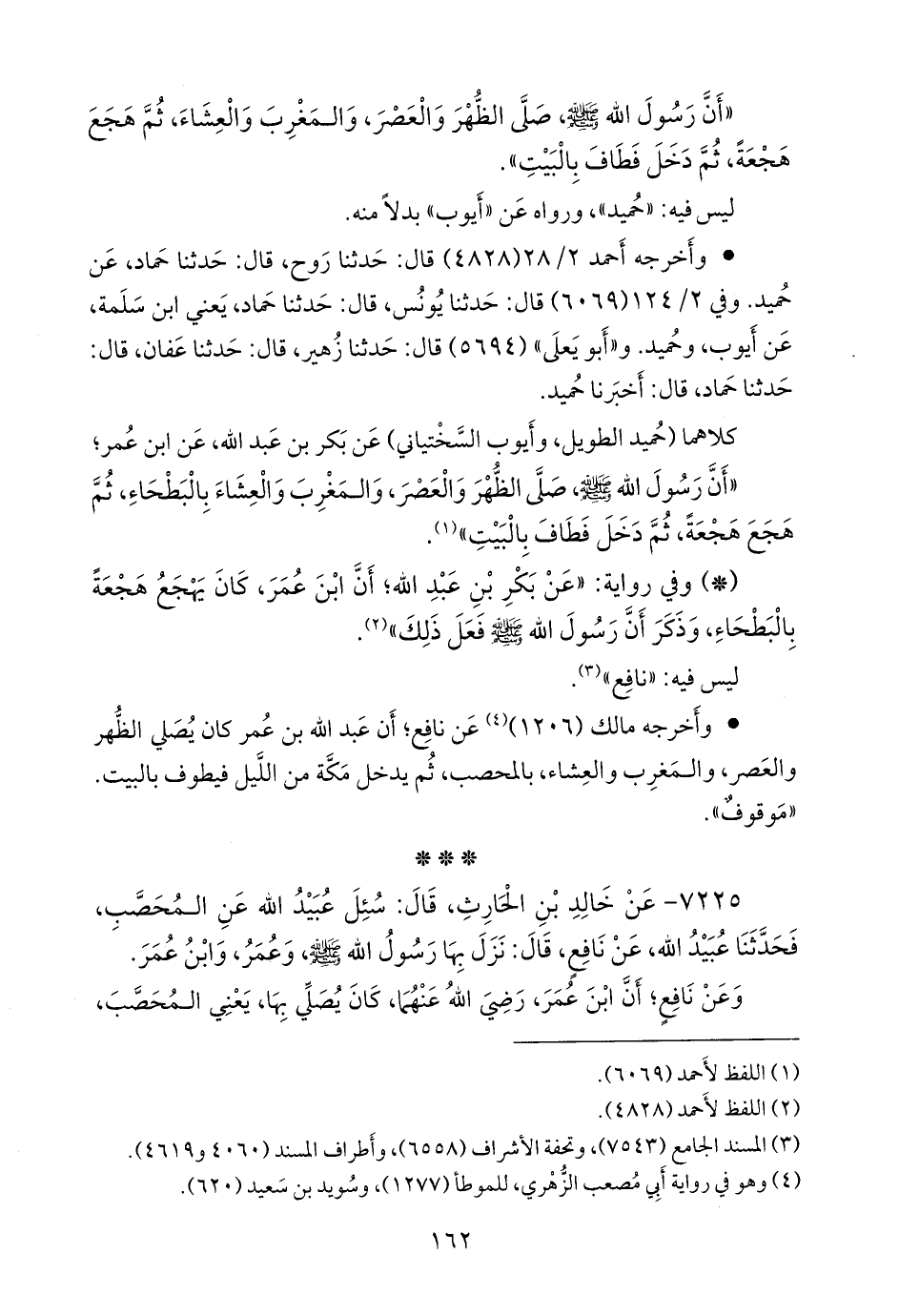 ٧٢٢٥ - عن خالد بن الحارث، قال: سئل عُبيد الله عن المحصب، فحدثنا عُبيد الله، عن نافع، قال: نزل بها رسول الله صَلى الله عَليه وسَلم وعمر، وابن عمر.