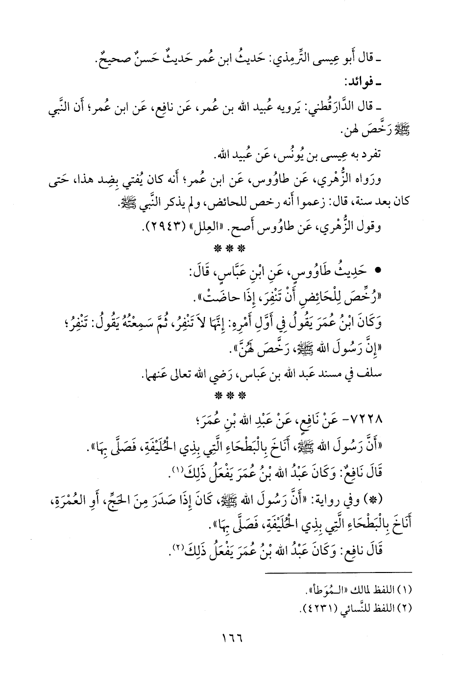- قال الدارقُطني: يرويه عُبيد الله بن عمر، عن نافع، عن ابن عمر؛ أن النبي صَلى الله عَليه وسَلم رخص لهن.