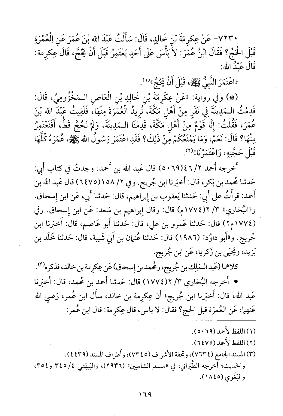 ٧٢٣٠ - عن عكرمة بن خالد، قال: سألت عبد الله بن عمر عن العمرة قبل الحج؟ فقال ابن عمر: لا بأس على أحد يعتمر قبل أن يحج، قال عكرمة: قال عبد الله: