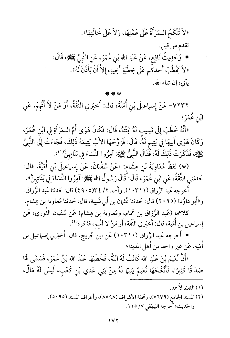 - لفظ معاوية بن هشام: «عن سفيان، عن إسماعيل بن أُمية، قال: حدثني الثقة، عن ابن عمر، قال: قال رسول الله صَلى الله عَليه وسَلم: آمروا النساء في بناتهن».
