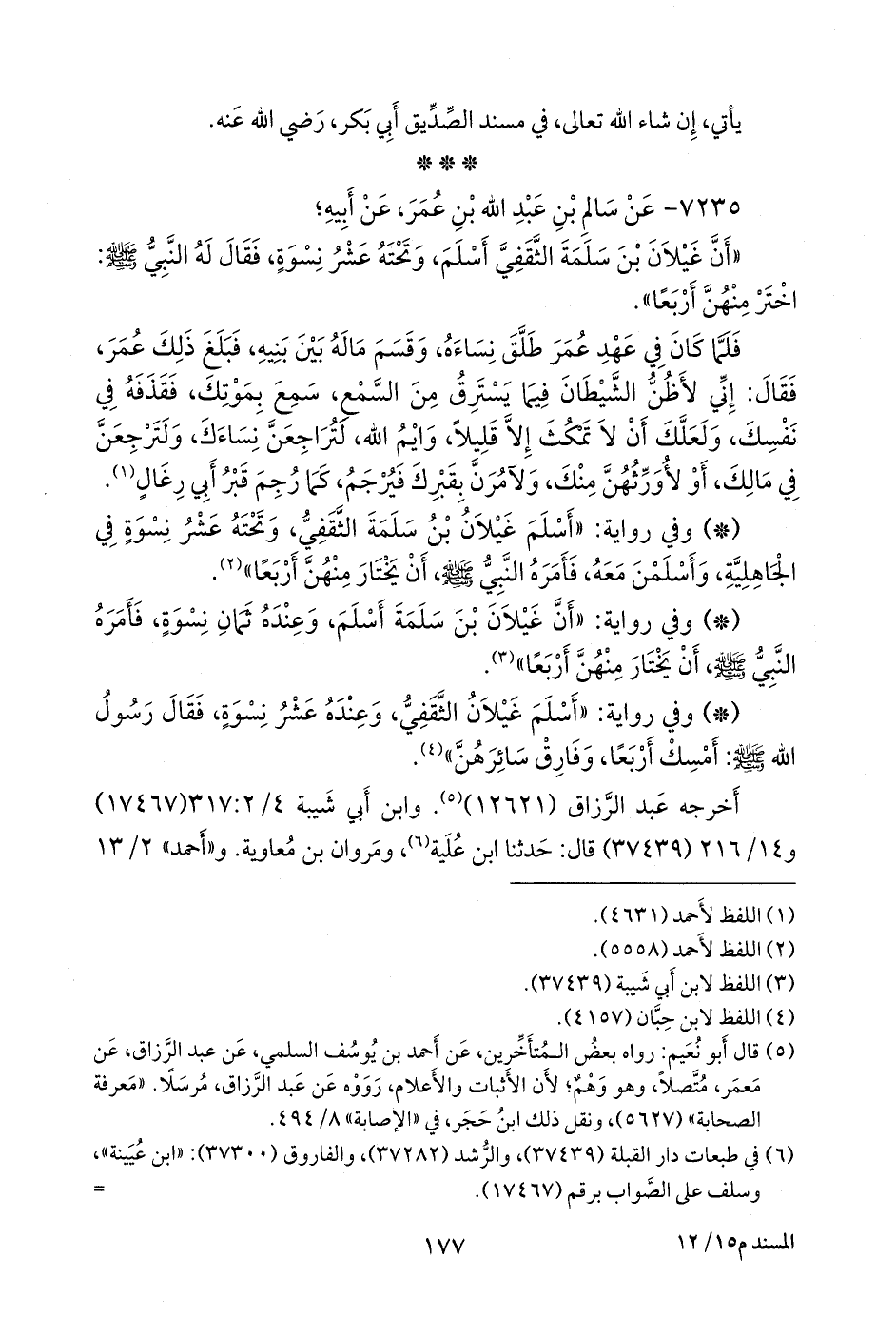 - وفي رواية: «أسلم غَيلان بن سلمة الثقفي، وتحته عشر نسوة في الجاهلية، وأسلمن معه، فأمره النبي صَلى الله عَليه وسَلم أن يختار منهن أربعا» (¬٢).