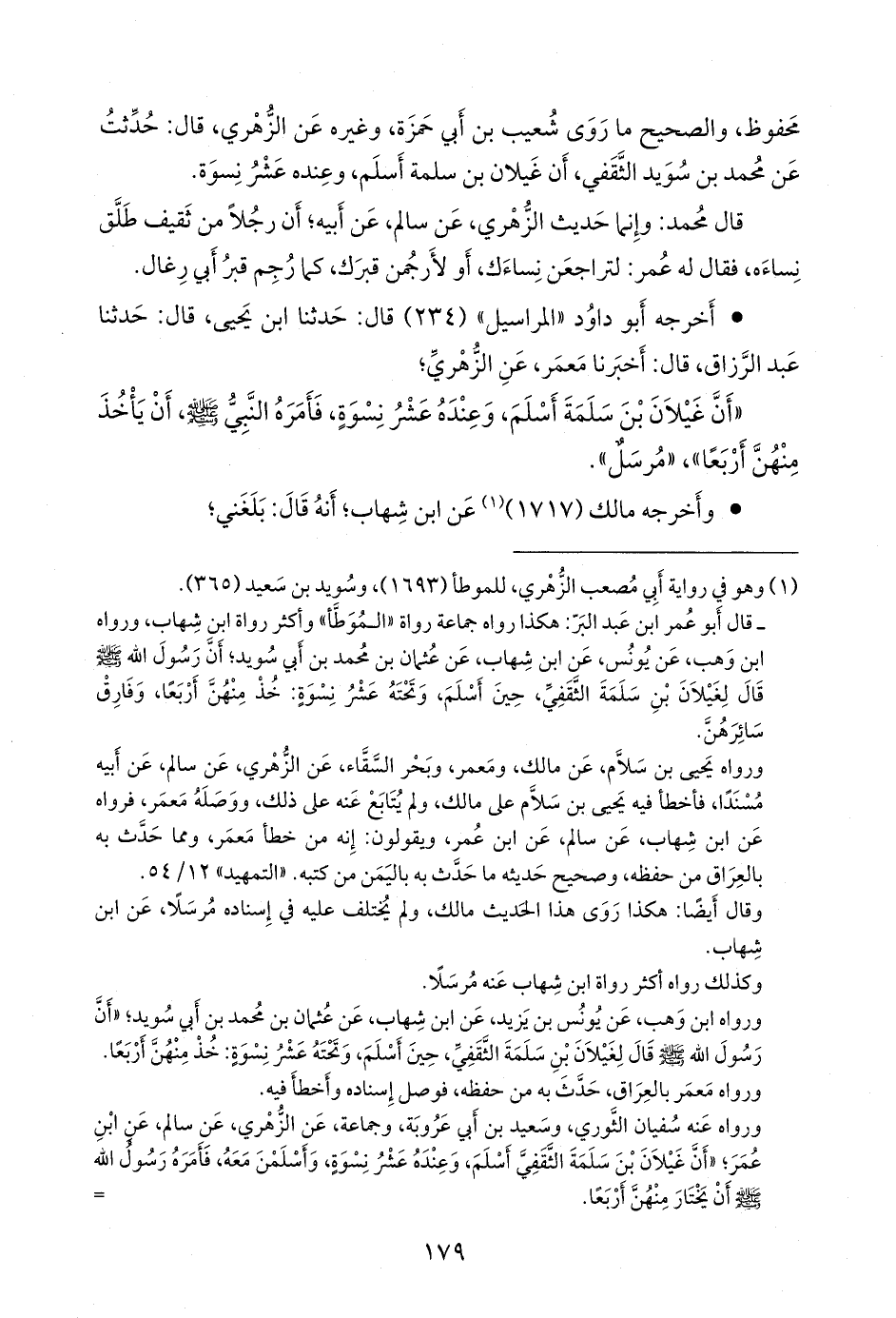 «أن غَيلان بن سلمة أسلم، وعنده عشر نسوة، فأمره النبي صَلى الله عَليه وسَلم أن يأخذ منهن أربعا»، «مُرسَل».