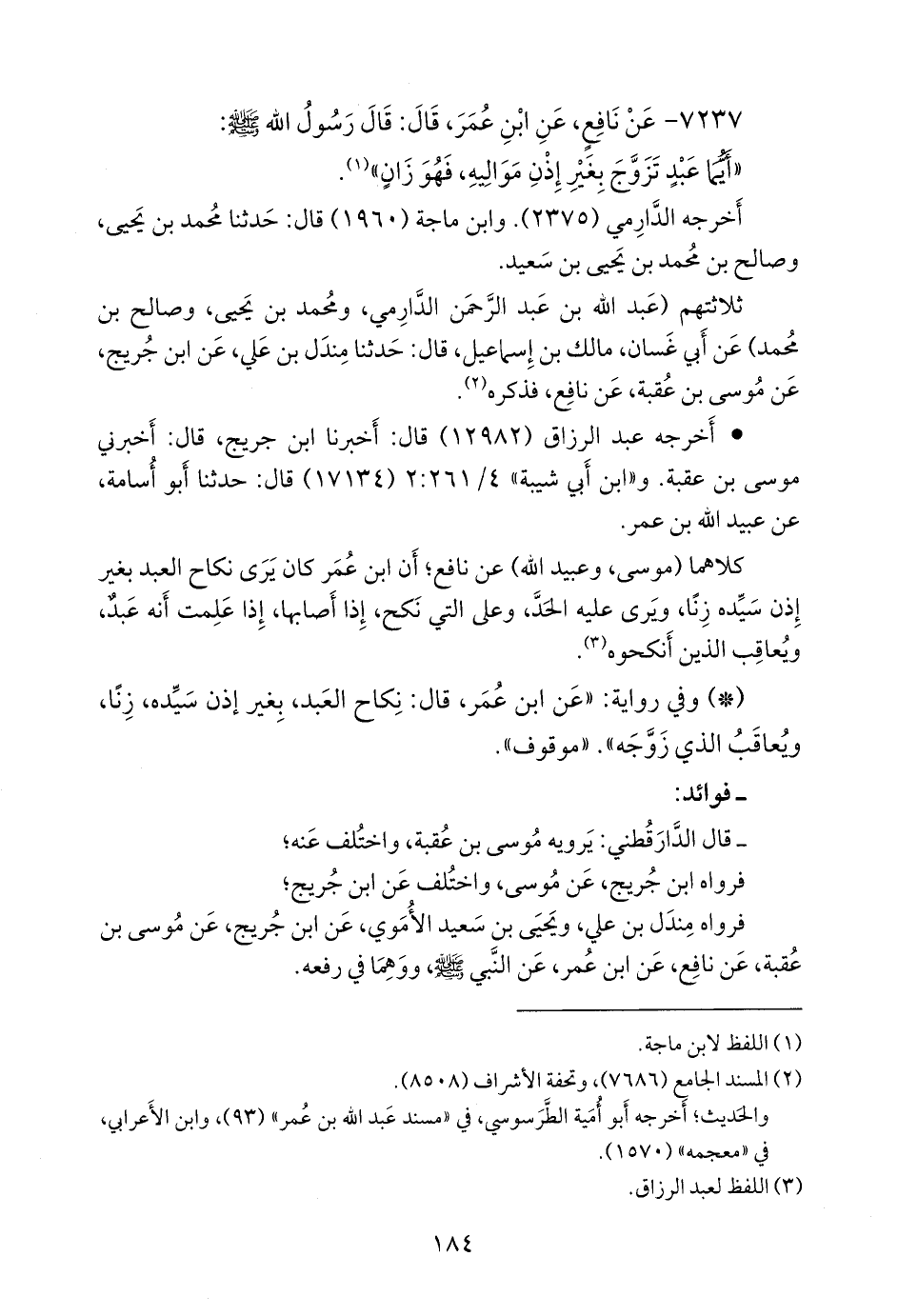 ثلاثتهم (عبد الله بن عبد الرَّحمَن الدَّارِمي، ومحمد بن يحيى، وصالح بن محمد) عن أبي غسان، مالك بن إسماعيل، قال: حدثنا مندل بن علي، عن ابن جُريج، عن موسى بن عُقبة، عن نافع، فذكره (¬٢).