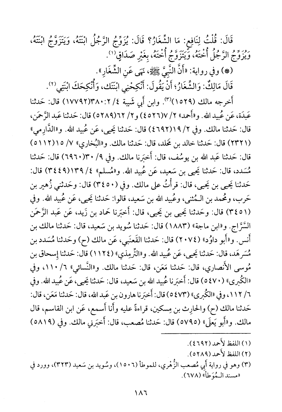 وفي (٣٤٥٠) قال: وحدثني زهير بن حرب، ومحمد بن المثنى، وعُبيد الله بن سعيد، قالوا: حدثنا يحيى، عن عُبيد الله. وفي (٣٤٥١) قال: وحدثنا يحيى بن يحيى، قال: أخبرنا حماد بن زيد، عن عبد الرَّحمَن السراج. و «ابن ماجة» (١٨٨٣) قال: حدثنا سويد بن سعيد، قال: حدثنا مالك بن أنس. و «أَبو داود» (٢٠٧٤) قال: حدثنا القَعنَبي، عن مالك (ح) وحدثنا مُسَدد بن مُسَرهد، قال: حدثنا يحيى، عن عُبيد الله. و «التِّرمِذي» (١١٢٤) قال: حدثنا إسحاق بن موسى الأَنصاري، قال: حدثنا مَعْن، قال: حدثنا مالك. و «النَّسَائي» ٦/ ١١٠، وفي «الكبرى» (٥٤٧٠) قال: أخبرنا عُبيد الله بن سعيد، قال: حدثنا يحيى، عن عُبيد الله. وفي ٦/ ١١٢، وفي «الكبرى» (٥٤٧٣) قال: أخبرنا هارون بن عبد الله، قال: حدثنا مَعْن، قال: حدثنا مالك (ح) والحارث بن مسكين، قراءة عليه وأنا أسمع، عن ابن القاسم، قال مالك. و «أَبو يَعلى» (٥٧٩٥) قال: حدثنا مصعب، قال: أخبرني مالك. وفي (٥٨١٩)