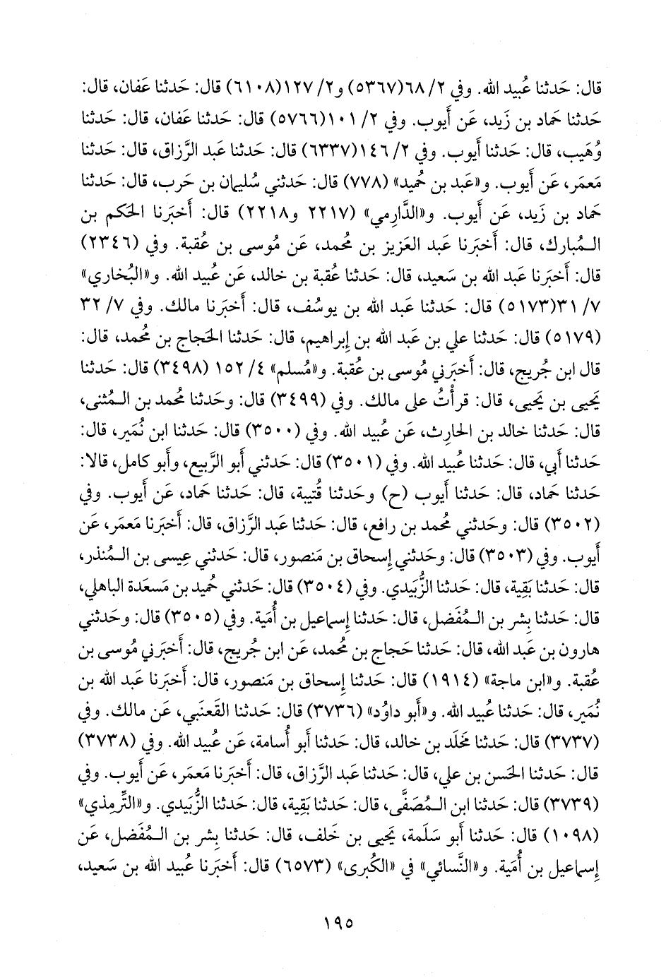 قال: حدثنا يحيى القطان، عن مالك. و «ابن حِبَّان» (٥٢٨٩) قال: أخبرنا الفضل بن الحُبَاب، قال: حدثنا سليمان بن حرب، قال: حدثنا حماد بن زيد، عن أيوب. وفي (٥٢٩٤) قال: أخبرنا عمر بن سعيد بن سنان، قال: أخبرنا أحمد بن أَبي بكر، عن مالك.