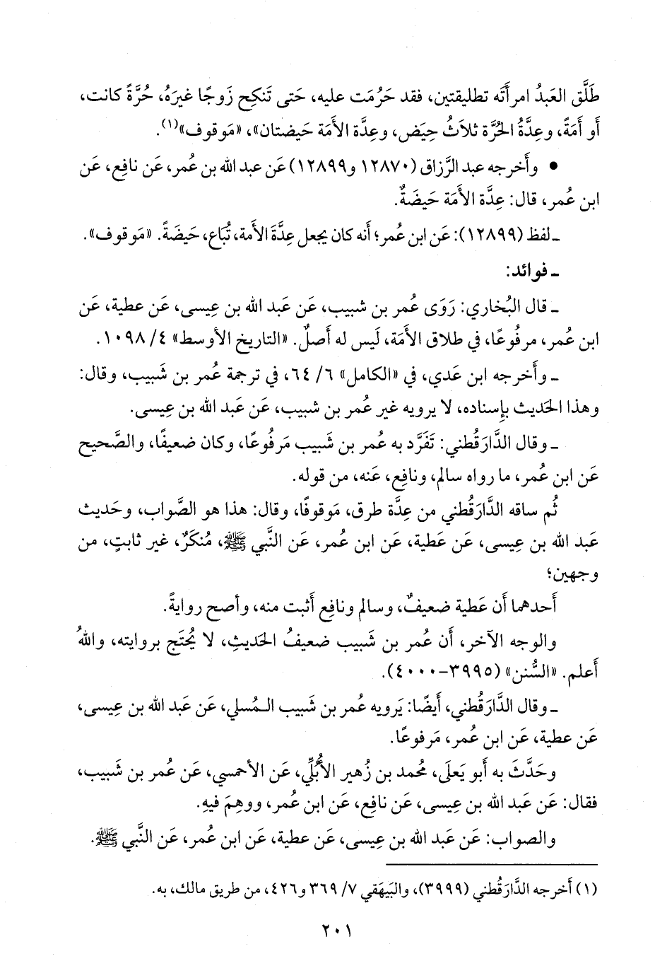 ثم ساقه الدارقُطني من عدة طرق، موقوفًا، وقال: هذا هو الصواب، وحديث عبد الله بن عيسى، عن عطية، عن ابن عمر، عن النبي صَلى الله عَليه وسَلم منكر، غير ثابت، من وجهين؛