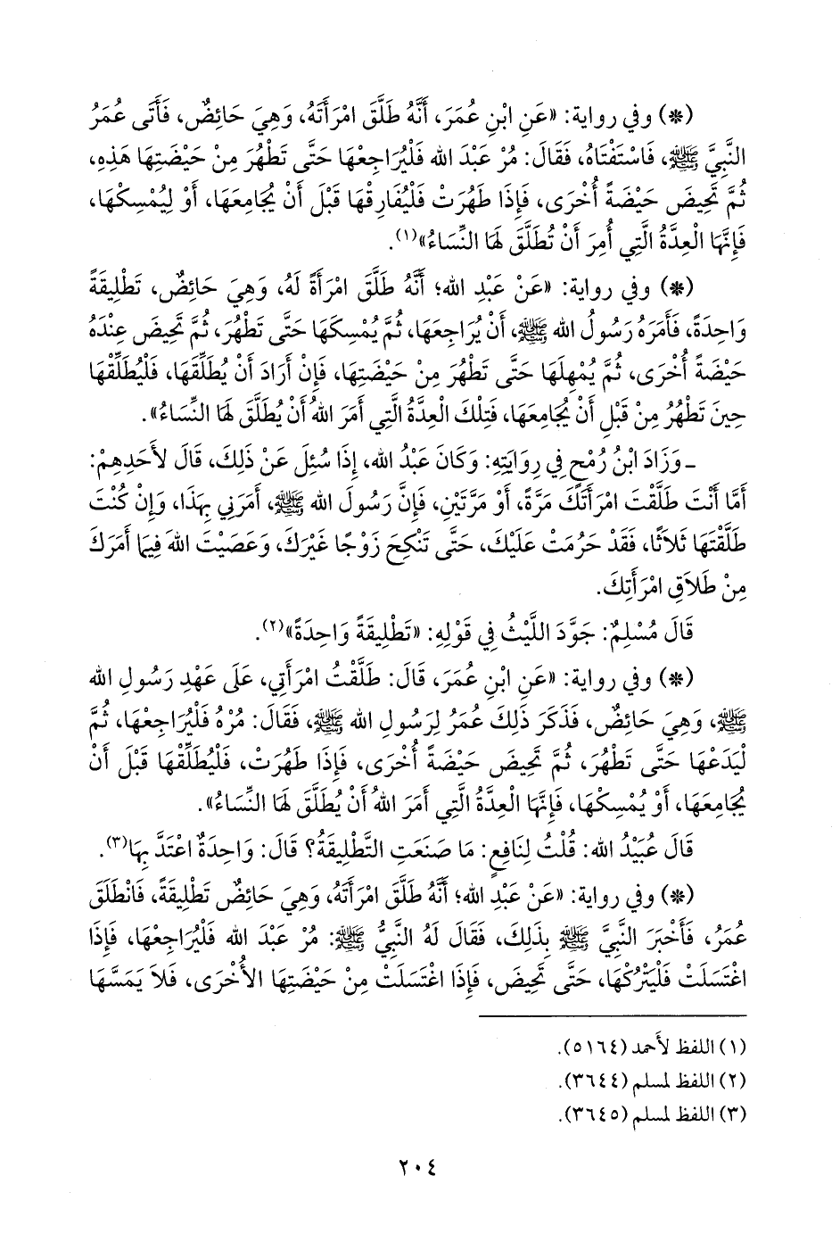 - وفي رواية: «عن ابن عمر، قال: طلقت امرأتي، على عهد رسول الله صَلى الله عَليه وسَلم وهي حائض، فذكر ذلك عمر لرسول الله صَلى الله عَليه وسَلم فقال: مره فليراجعها، ثم ليدعها حتى تطهر، ثم تحيض حيضة أخرى، فإذا طهرت، فليطلقها قبل أن يجامعها، أو يمسكها، فإنها العدة التي أمر الله أن يطلق لها النساء».