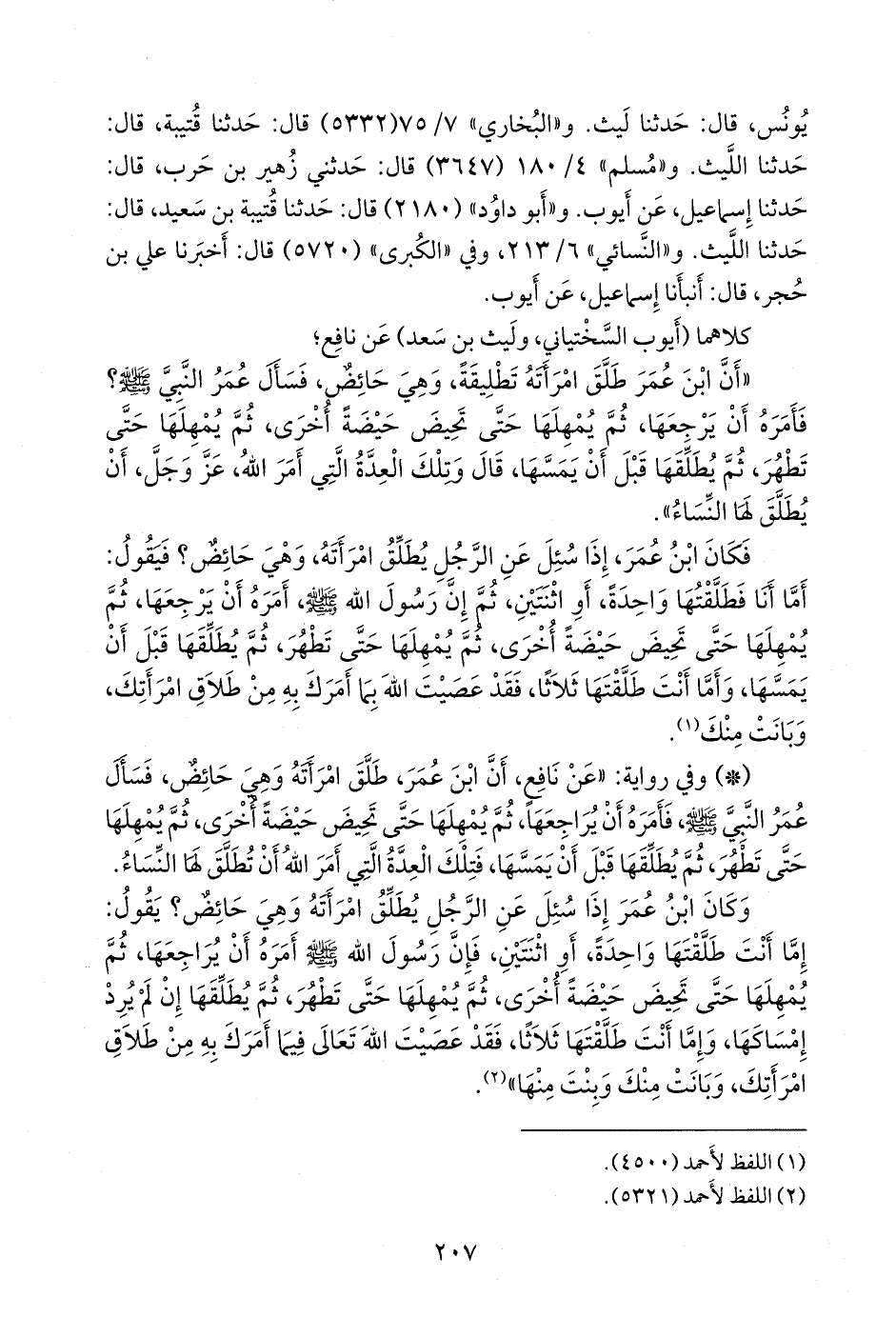 - وفي رواية: «عن نافع؛ أن عبد الله طلق امرأته، وهي حائض، تطليقة واحدة، على عهد رسول الله صَلى الله عَليه وسَلم فقال عمر: يا رسول الله، إن عبد الله طلق امرأته، تطليقة واحدة، وهي حائض، فأمره رسول الله صَلى الله عَليه وسَلم أن يراجعها، ويمسكها حتى تطهر، ثم تحيض عنده حيضة أخرى، ثم يمهلها حتى تطهر من حيضتها، فإن أراد أن يطلقها، فليطلقها حين تطهر، قبل أن يجامعها، فتلك العدة التي أمر الله، تعالى، أن يطلق لها النساء.