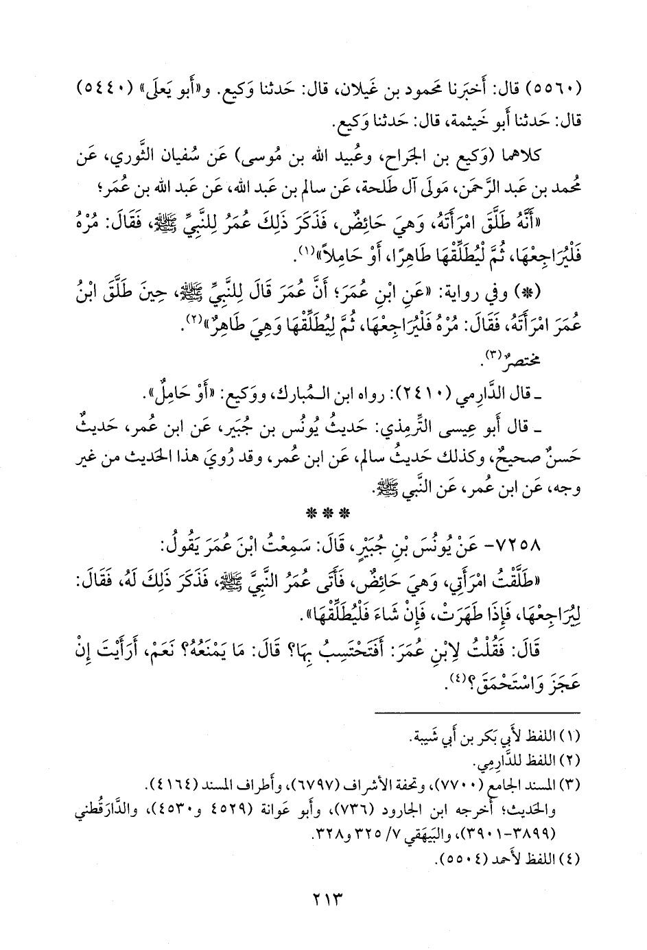 «طلقت امرأتي، وهي حائض، فأتى عمر النبي صَلى الله عَليه وسَلم فذكر ذلك له، فقال: ليراجعها، فإذا طهرت، فإن شاء فليطلقها».