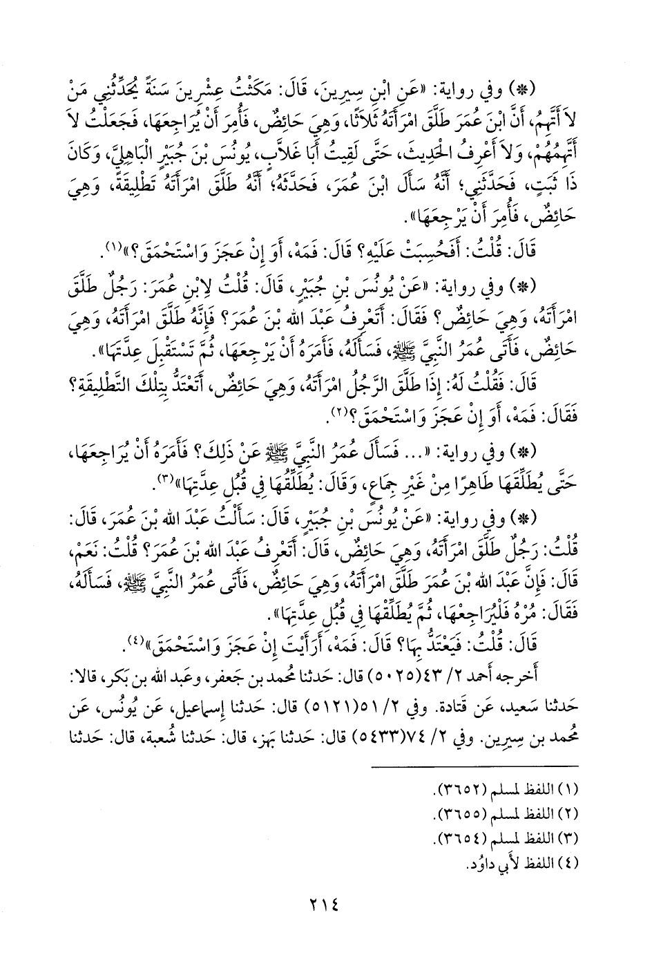 - وفي رواية: «عن يونس بن جبير، قال: سألت عبد الله بن عمر، قال: قلت: رجل طلق امرأته، وهي حائض، قال: أتعرف عبد الله بن عمر؟ قلت: نعم، قال: فإن عبد الله بن عمر طلق امرأته، وهي حائض، فأتى عمر النبي صَلى الله عَليه وسَلم فسأله، فقال: مره فليراجعها، ثم يطلقها في قبل عدتها».