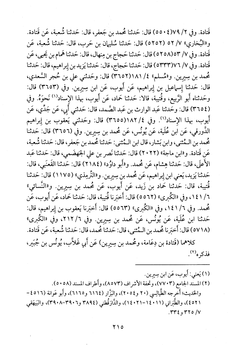 وفي (٣٦٥٣) قال: وحدثناه أَبو الربيع، وقتيبة، قالا: حدثنا حماد، عن أيوب، بهذا الإسناد (¬١) نحوه. وفي (٣٦٥٤) قال: وحدثنا عبد الوارث بن عبد الصمد، قال: حدثني أبي، عن جدي، عن أيوب، بهذا الإسناد (٣). وفي ٤/ ١٨٢ (٣٦٥٥) قال: وحدثني يعقوب بن إبراهيم الدورقي، عن ابن عُلَية، عن يونس، عن محمد بن سِيرين. وفي (٣٦٥٦) قال: حدثنا محمد بن المثنى، وابن بشار، قال ابن المثنى: حدثنا محمد بن جعفر، قال: حدثنا شعبة، عن قتادة. و «ابن ماجة» (٢٠٢٢) قال: حدثنا نصر بن علي الجهضمي، قال: حدثنا عبد الأعلى، قال: حدثنا هشام، عن محمد. و «أَبو داود» (٢١٨٤) قال: حدثنا القَعنَبي، قال: حدثنا يزيد، يعني ابن إبراهيم، عن محمد بن سِيرين. و «التِّرمِذي» (١١٧٥) قال: حدثنا قتيبة، قال: حدثنا حماد بن زيد، عن أيوب، عن محمد بن سِيرين. و «النَّسَائي» ٦/ ١٤١، وفي «الكبرى» (٥٥٦٢) قال: أخبرنا قتيبة، قال: حدثنا حماد، عن أيوب، عن محمد. وفي ٦/ ١٤١، وفي «الكبرى» (٥٥٦٣) قال: أخبرنا يعقوب بن إبراهيم، قال: حدثنا ابن عُلَية، عن يونس، عن محمد بن سِيرين. وفي ٦/ ٢١٢، وفي «الكبرى» (٥٧١٨) قال: أخبرنا محمد بن المثنى، قال: حدثنا محمد، قال: حدثنا شعبة، عن قتادة.
