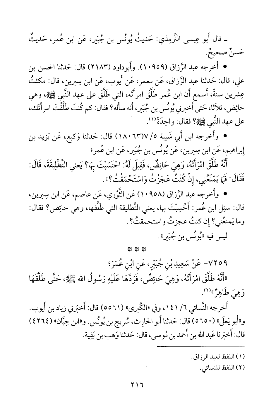 - أَخرجه عبد الرزاق (١٠٩٥٩). وأَبوداود (٢١٨٣) قال: حدثنا الحسن بن علي، قال: حدثنا عبد الرزاق، عن مَعمَر، عن أيوب، عن ابن سِيرين، قال: مكثت عشرين سنة، أسمع أن ابن عمر طلق امرأته، التي طلق على عهد النبي صَلى الله عَليه وسَلم وهي حائض، ثلاثا، حتى أخبرني يونس بن جبير، أنه سأله؟ فقال: كم كنت طلقت امرأتك، على عهد النبي صَلى الله عَليه وسَلم؟ فقال: واحدة (¬١).