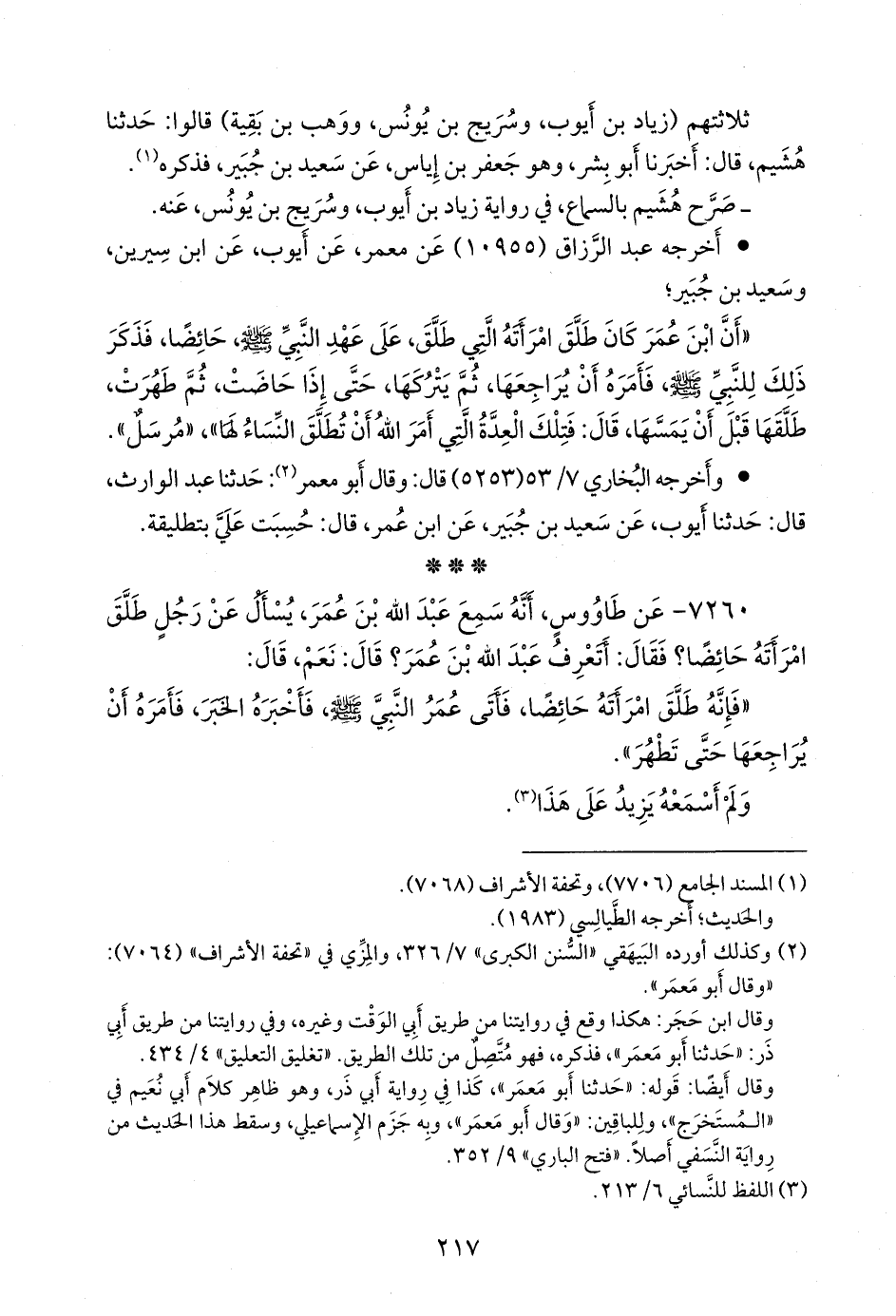 ٧٢٦٠ - عن طاووس، أنه سمع عبد الله بن عمر، يسأل عن رجل طلق امرأته حائضا؟ فقال: أتعرف عبد الله بن عمر؟ قال: نعم، قال: