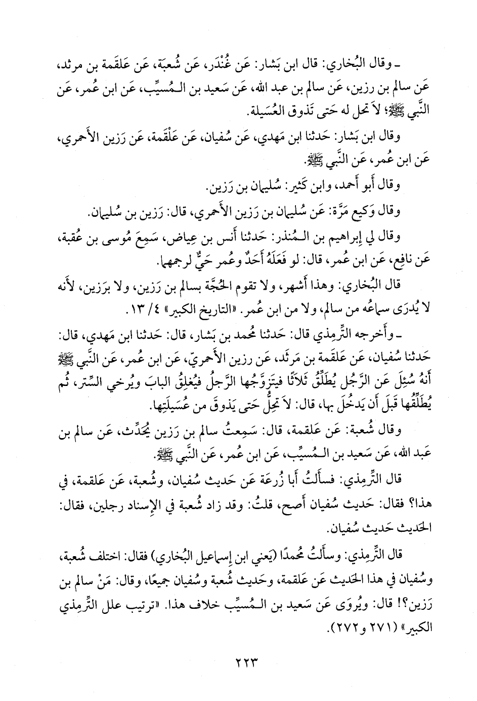 قال التِّرمِذي: وسألتُ محمدًا، يعني ابن إسماعيل البخاري، فقال: اختلف شعبة، وسفيان في هذا الحديث عن علقمة، وحديث شعبة وسفيان جميعا، وقال: من سالم بن رَزين؟! قال: ويروى عن سعيد بن المُسَيب خلاف هذا. «ترتيب علل التِّرمِذي الكبير» (٢٧١ و ٢٧٢).