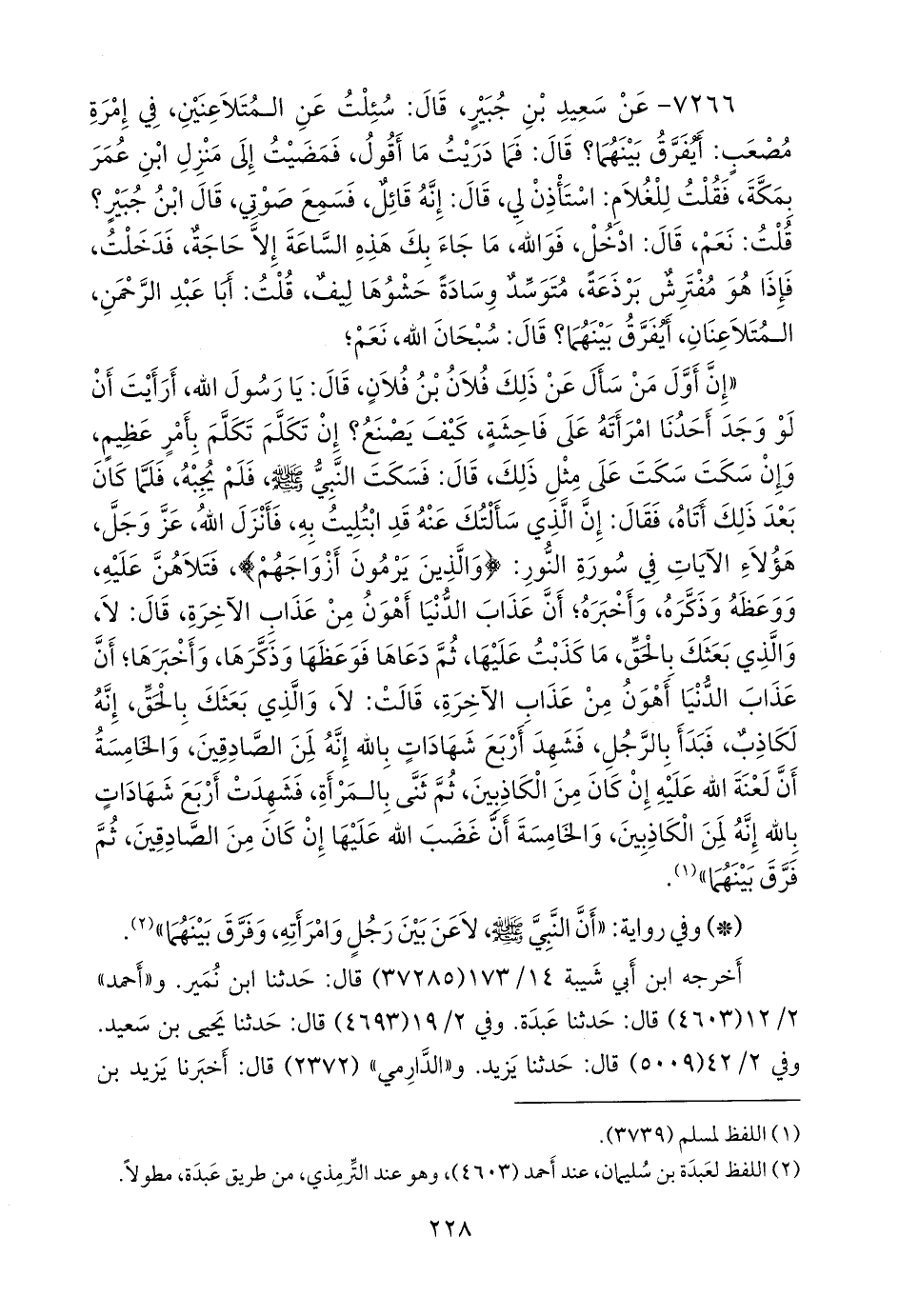 ٧٢٦٦ - عن سعيد بن جبير، قال: سئلت عن المتلاعنين، في إمرة مصعب: أيفرق بينهما؟ قال: فما دريت ما أقول، فمضيت إلى منزل ابن عمر بمكة، فقلت للغلام: استأذن لي، قال: إنه قائل، فسمع صوتي، قال ابن جبير؟ قلت: نعم، قال: ادخل، فوالله، ما جاء بك هذه الساعة إلا حاجة، فدخلت، فإذا هو مفترش برذعة، متوسد وسادة حشوها ليف، قلت: أبا عبد الرَّحمَن، المتلاعنان، أيفرق بينهما؟ قال: سبحان الله، نعم؛