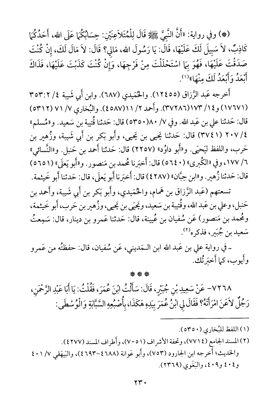 ٧٢٦٨ - عن سعيد بن جبير، قال: سألت ابن عمر، فقلت: يا أبا عبد الرَّحمَن، رجل لاعن امرأته؟ فقال لي ابن عمر بيده هكذا، بأصبعه السبابة والوسطى:
