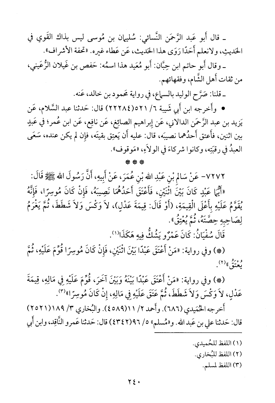 - وفي رواية: «من أعتق عبدًا بينه وبين آخر، قوم عليه في ماله، قيمة عدل، لا وكس ولا شطط، ثم عتق عليه في ماله، إن كان موسرا» (¬٣).