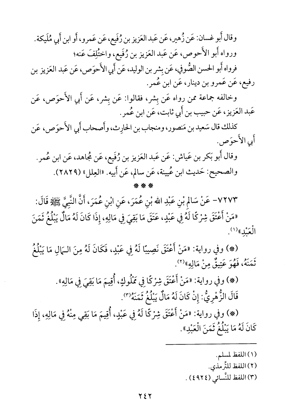 ٧٢٧٣ - عن سالم بن عبد الله بن عمر، عن ابن عمر، أن النبي صَلى الله عَليه وسَلم قال: